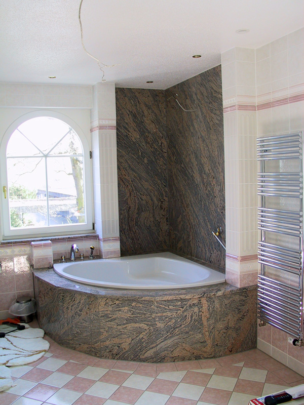 Im Badezimmer schafft Naturstein eine besondere Atmosphäre. Von der Wandverkleidung über Waschtische bis hin zur Badewanne lässt sich der Raum individuell gestalten und zu einer Wohlfühloase verwandeln.